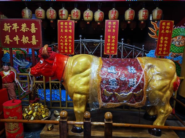 1階の奥には、日本でも見かける「撫で牛」の、かなり派手版の牛さんもおります。